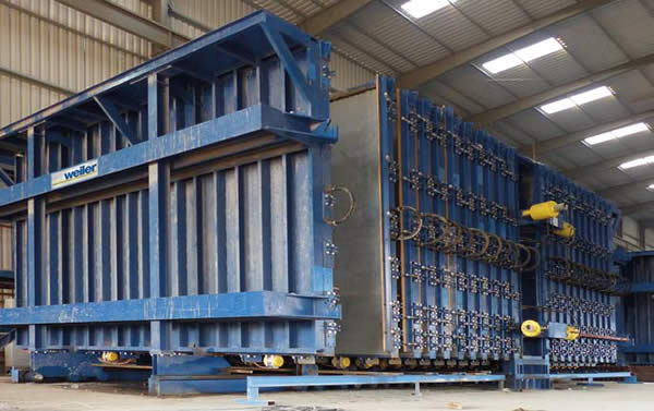 - تم دفع الحجيرات معًا، وإغلاقها قبل التعبئة بالخرسانة. لم يتم قفلها، ولكن تم سحبها بشكل منفرد لإزالة الهيكل المؤقت والألواح الجدارية.