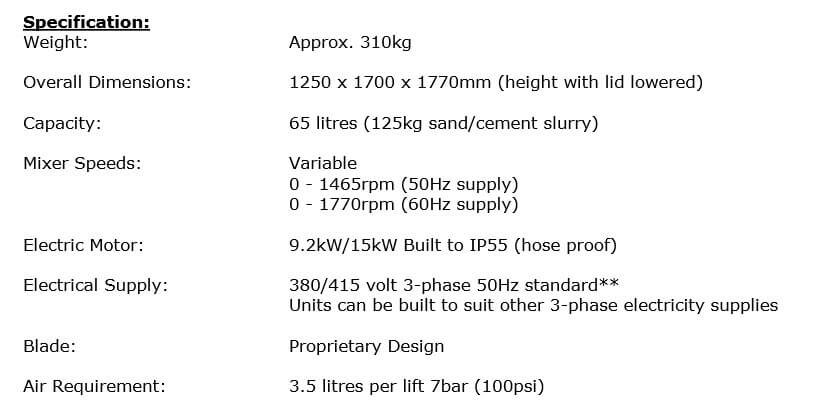 All the features of the GRC125 Combination Mixer with tilting mixing drum allowing the mix to be discharged directly into a mould, pump, or spray station.