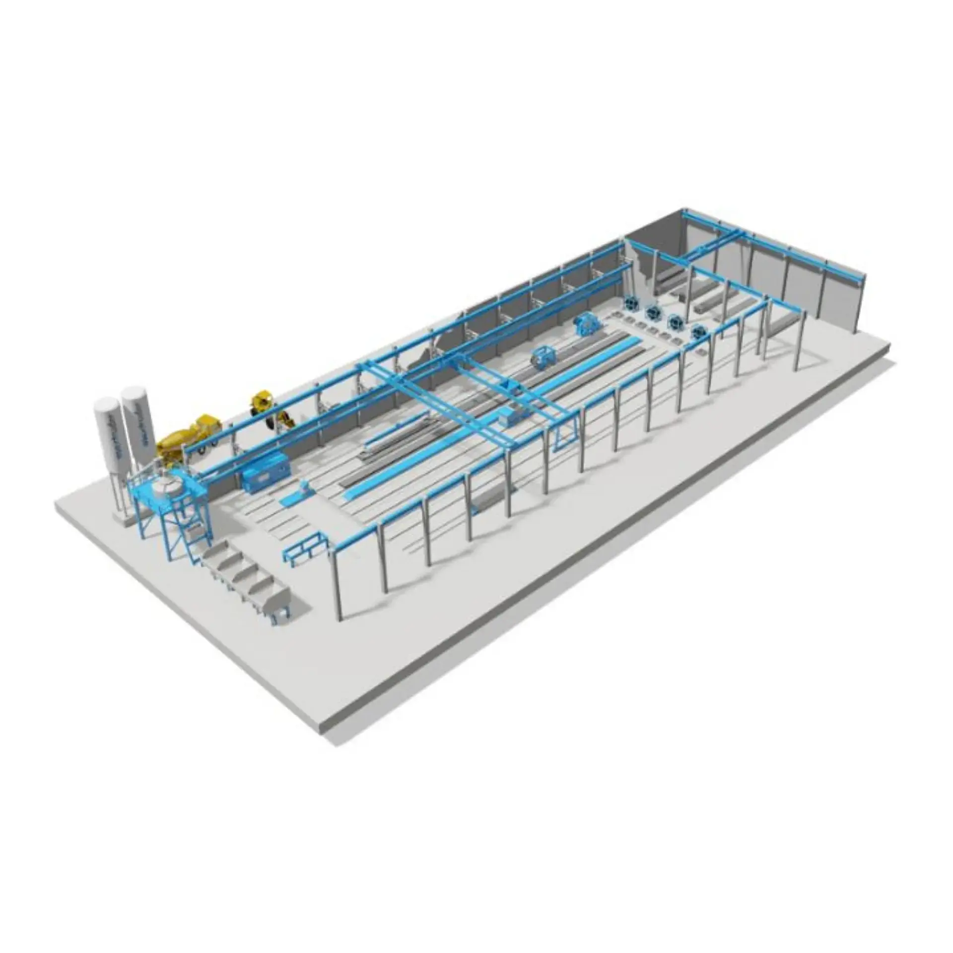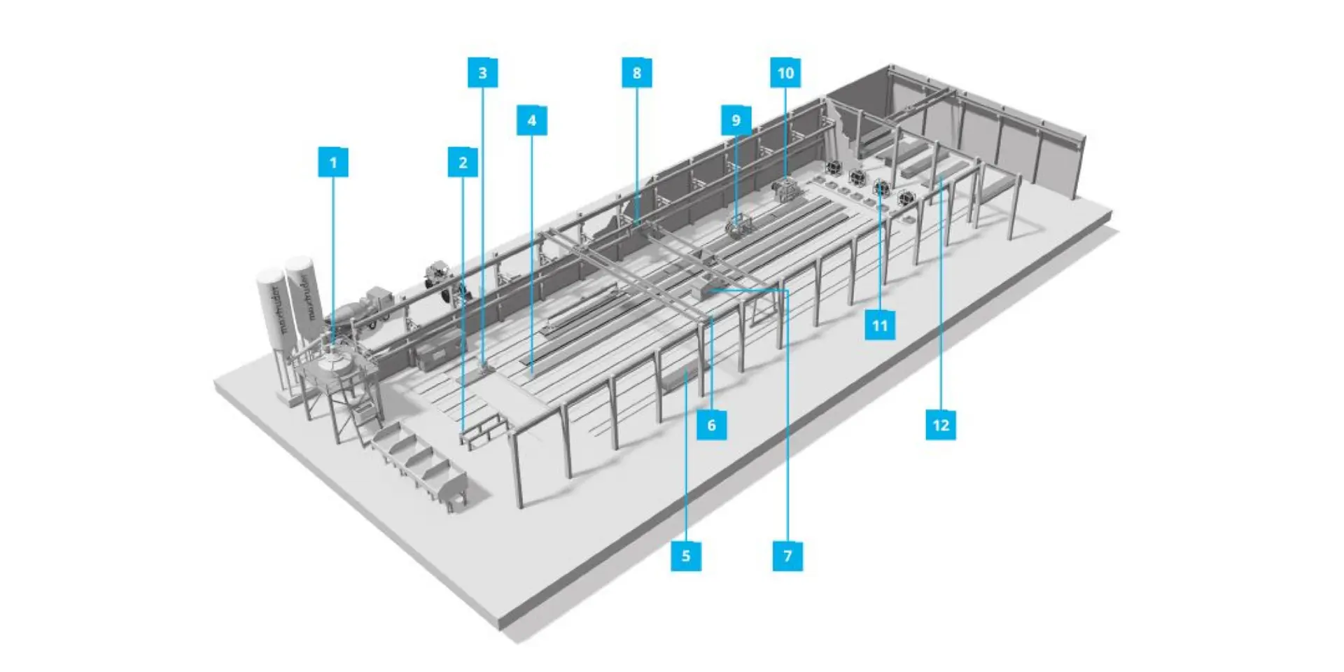 Modular, scalable stationary production technology ensures optimal precast production with maximum output. Low running costs and the highest quality end products permit a short-term return on investment. Our modular system allows easy conversions, retrofits and upgrades, for example in capacity, product range, degree of automation. A highly automated precast plant starting from the concrete mixing plant to the concrete transport to the production machine avoids manual errors. Applied industrial procedures ensure highly efficient production. The enormous cement savings and minimal water consumption of our hollow core slab production modules enable further efficiency increases in two- or three-shift operation.